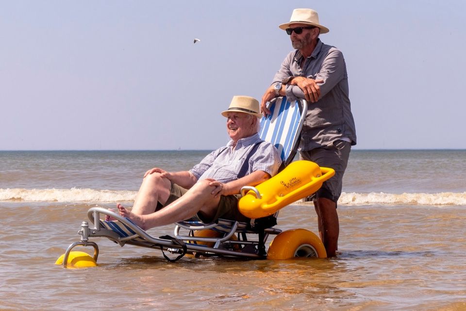 Dank des WaterWheels-Designs kann dieser schwimmende Strandrollstuhl ins Meer fahren und so können auch Sie das Meer genießen.