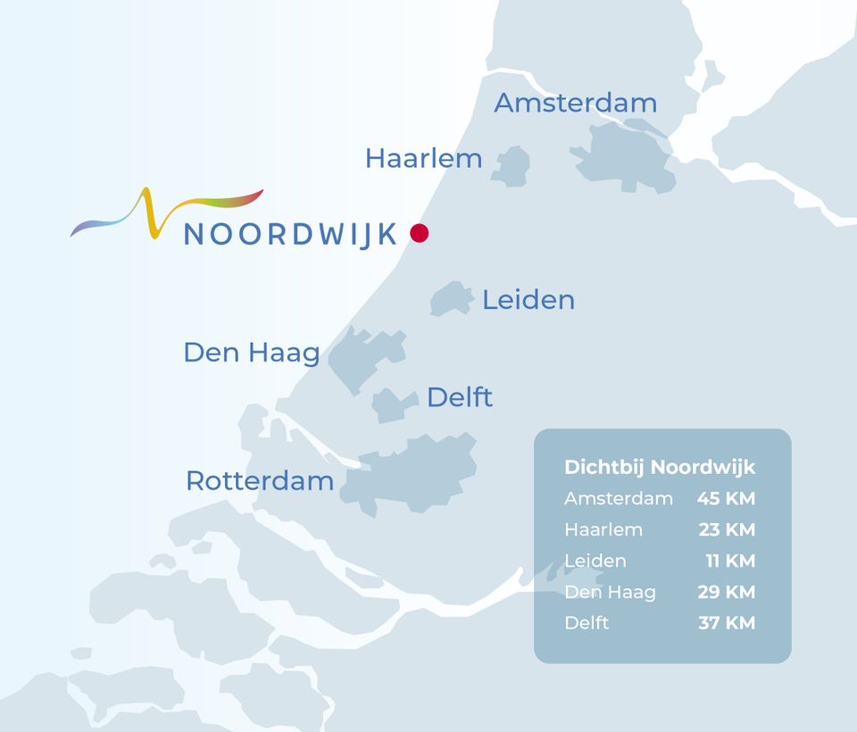 Großstädte wie Leiden (11 km), Amsterdam (45 km) und Den Haag (29 km) liegen in der Nähe. Innerhalb von 30 Minuten erreichen Sie den Flughafen Schiphol (25 km) und den Flughafen Rotterdam Den Haag (40 km). Die nahegelegenen Bahnhöfe Voorhout (7 km), Sassenheim (7 km) und Leiden (11 km) sowie das umfangreiche Busnetz sorgen für eine hervorragende Anbindung.
