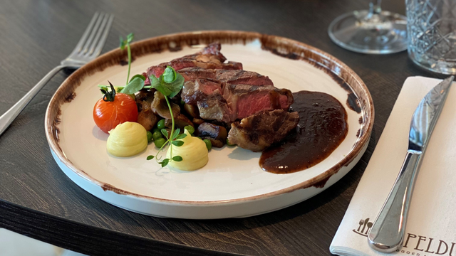 ossenhaas · Parmezaanse kaas · zongedroogde tomaat · rucola · truffeldressing
