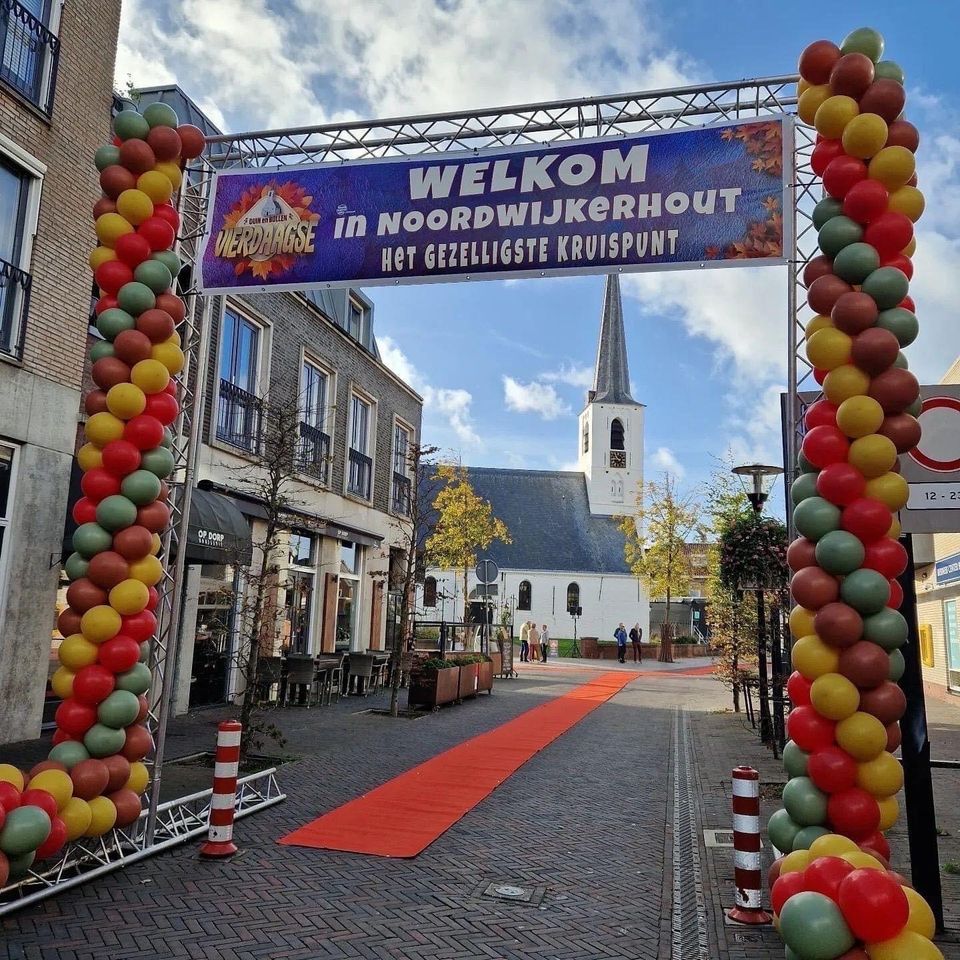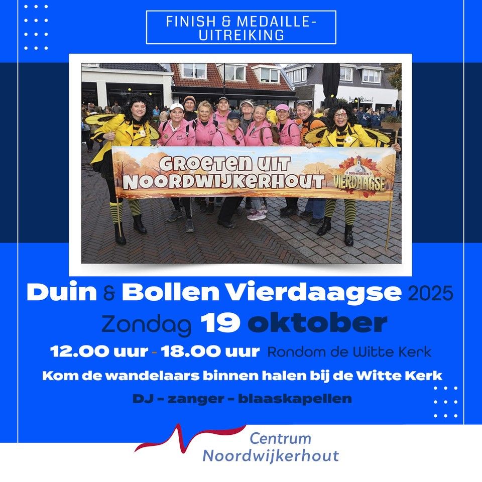 Zondag 19 oktober vormt het centrum van Noordwijkerhout het decor van de feestelijke slotdag van de Duin en Bollen Vierdaagse. Tussen 12.00 en 18.00 uur bruist het centrum van de gezelligheid, als warm onthaal voor de wandelaars! Nadat de wandelaars de laatste meters door de Havenstraat hebben gemaakt, wacht hen bij de finish een warm welkom door twee hartelijke gastvrouwen in het sfeervolle gebied rondom de Witte Kerk.