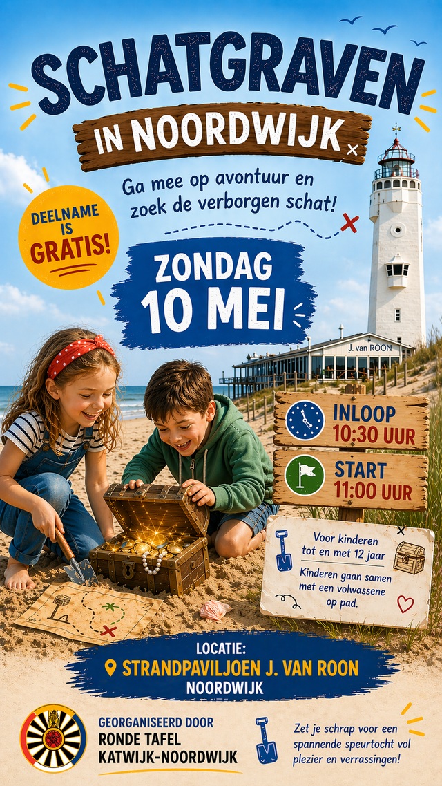 Op zondag 10 mei vindt op het Noordwijkse strand wederom het schatgraven voor kinderen plaats! Kinderen tot en met 12 jaar zijn van harte welkom om naar mooie schatten te graven.