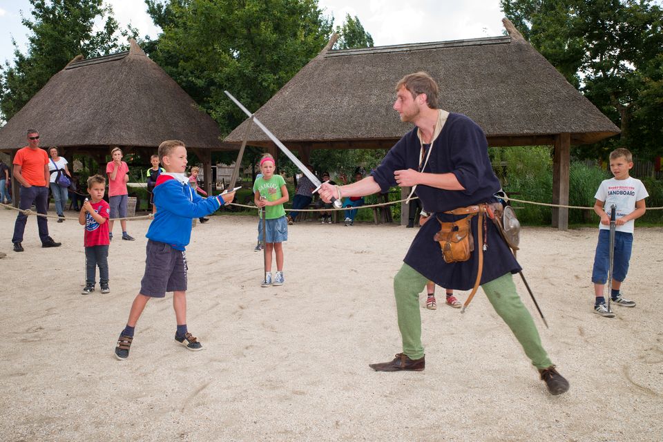 Travel back in time – a long way back- to the camp of the early hunter-gatherers.You can climb into a canoe carved from a single tree trunk and hunt with a real spear! In the Roman town you can visit the Roman Bathhouse and enjoy a real Roman massage. You can also make your own fibulae, join the Roman games and drill with the Legionnaires. In the afternoon the townspeople gather in the arena to watch the gladiators fight.