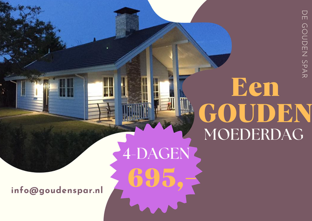 Book the unique package now from 9 to 12 May and receive: - Three nights' accommodation in a cosy cottage (up to a maximum of 6 people) - Beds made up for FREE! - A Mother's Day Bouquet and a Gift on the table upon arrival. - Sleep in on Monday with a Lazy ‘’Mom‘’day; Check-out at 12:00. - Extensive Mother's Day breakfast on Sunday 11 May (pick-up between 08:10 and 08:20 at the bread van at the park). All this and of course relaxation for just €695.00! (based on 4 persons) Mail, or call us for availability! Attention: Gone=Gone... (Price does not include tourist tax á € 2,45 p.p.p.n. Final cleaning á € 62,50 and a deposit of € 100,00. Extra person surcharge of € 25.00 p.p.)