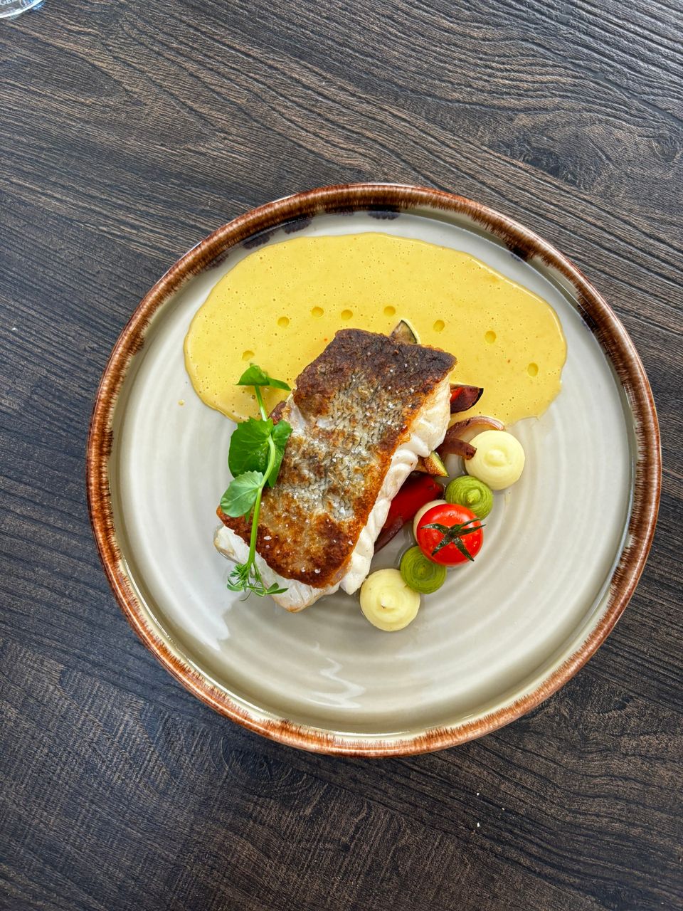 Op de huid gebakken kabeljauw · seizoensgroenten · aardappelmousseline · kerrie beurre blanc