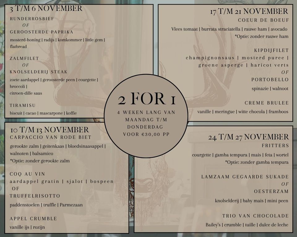 Geniet in november wekelijks van ons culinair bereide 2FOR1-menu.
