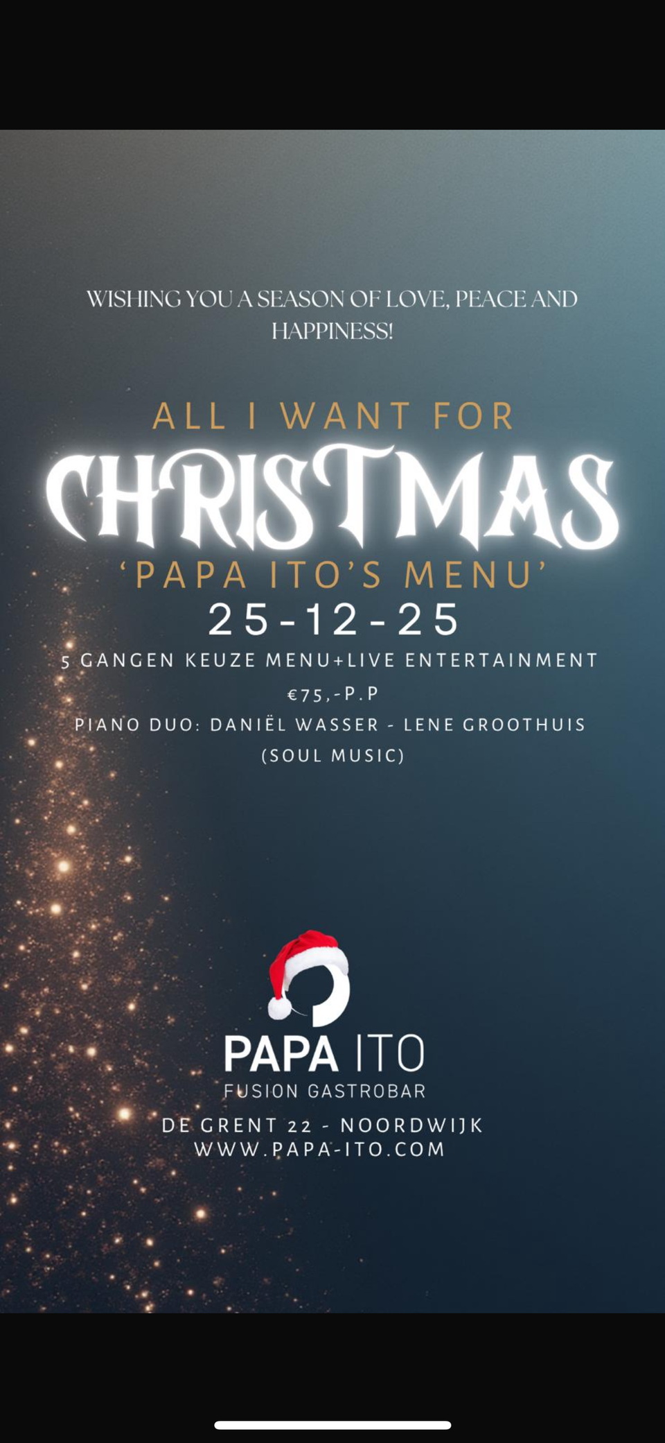 Geniet op 25 december van een 5-gangen keuzemenu met live entertainment door het piano/zang duo Daniel Wasser & Lene Groothuis bij Papa Ito. Laat je verrassen door culinaire hoogstandjes, muziek en gezelligheid.
