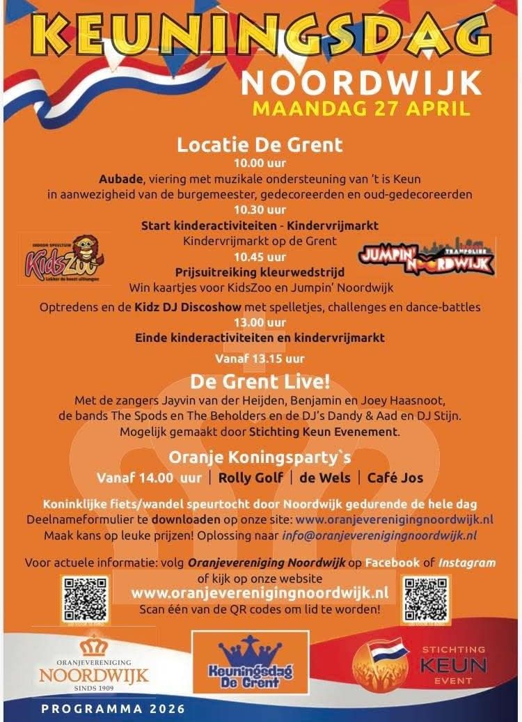 Op 27 april is het Koningsdag. Oftewel: Keuningsdag in Noordwijk! Met onder andere de traditionele aubade en de Kindervrijmarkt, maar ook De Grent Live!, verschillende Oranje Koningsparty’s en nog veel meer!