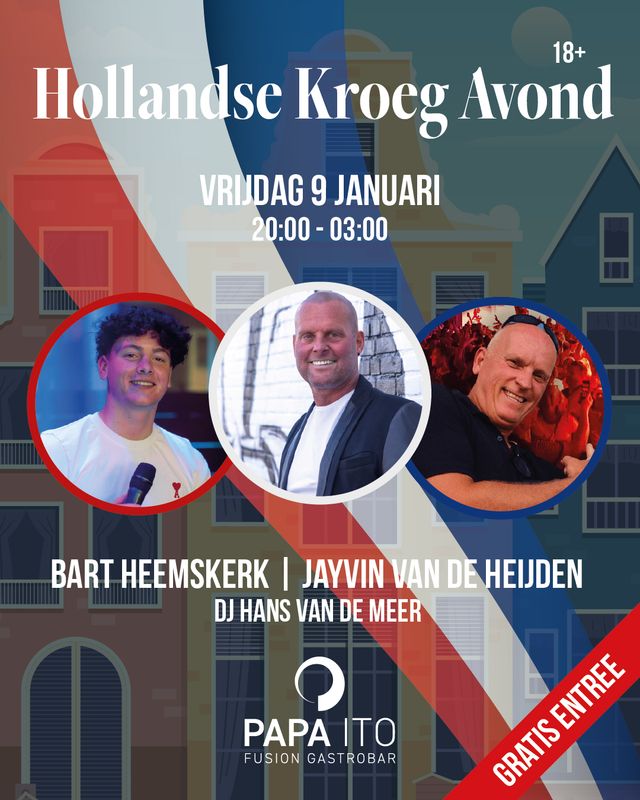 Op vrijdag 9 januari gaat Papa Ito het even anders doen. We hebben geen diner, maar een gezellige bruine kroeg avond met DJ Hans vd Meer, zanger Bart Heemskert en zanger Jayvin vd Heijden. Voor iedereen toegankelijk
